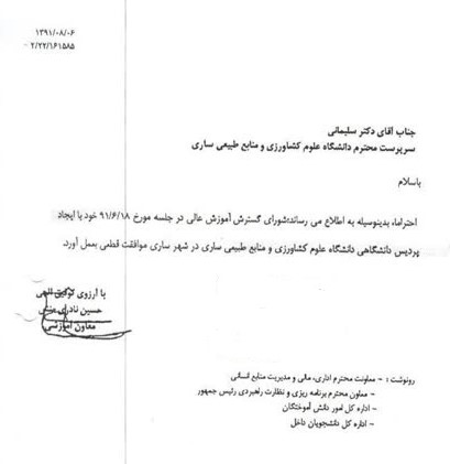 در ۱۸ شهریور ۱۳۹۱، پردیس دانشگاه علوم کشاورزی و منابع طبیعی ساری به صورت قطعی صادره شده است.