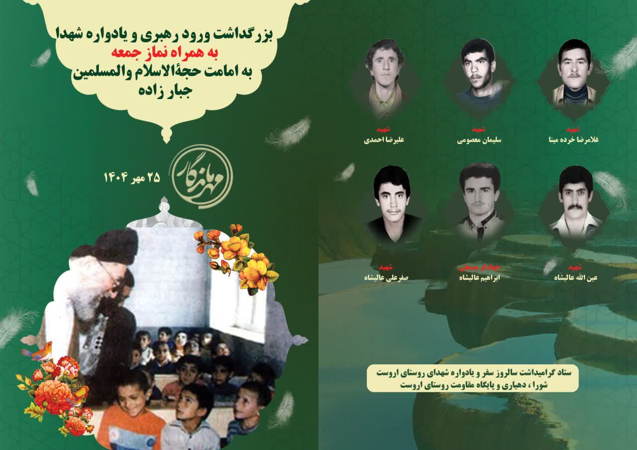 به مناسبت سی امین سالگرد حضور مقام معظم رهبری در روستای اروست ، نماز عبادی سیاسی جمعه اینهفته بخش چهاردانگه در روز جمعه ۲۵ مهر ۱۴۰۴ در روستای اروست قدمگاه مقام معظم رهبری به امامت حجت الاسلام جبارزاده امام جمعه بخش چهاردانگه برگزار می شود.