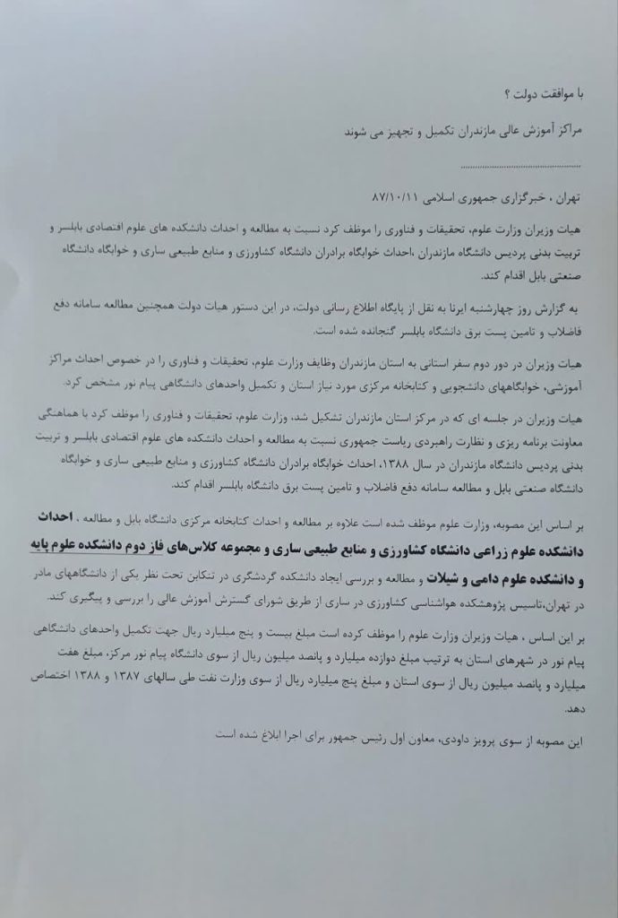 مدیر جدید دانشگاه! شما خود نیک میدانید دولت هشتم در 16آذر ۱۳۸۵ در سفر استانی مصوب نمود تا مجتمع فنی بابل به دانشگاه صنعتی نوشیروانی و مجتمع کشاورزی و منابع طبیعی ساری به دانشگاه ارتقاء یابد. همانطوری که ملاحظه میفرمایید، مجتمع فنی بابل به دانشگاه صنعتی قید شده است، اما برای مجتمع کشاورزی و منابع طبیعی ساری صرفا عنوان دانشگاه را آورده است. هرجا صرفا دانشگاه آورده میشود، منظور دانشگاه جامع است نه دانشگاه تخصصی. متاسفانه عدهای ذی نفع این مصوبه مهم را که میتوانست باعث جهش علمی مرکز استان شود را به دانشگاه علوم کشاورزی و منابع طبیعی تنزل دادند.
